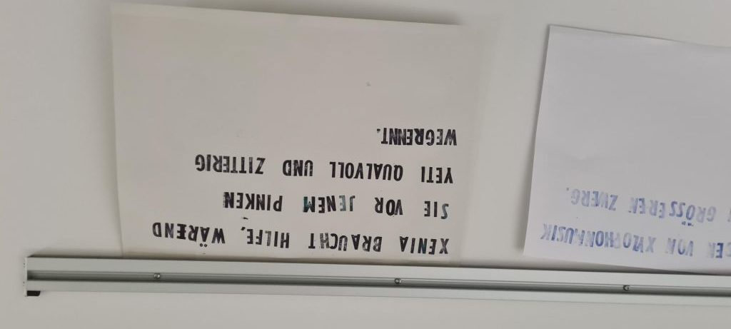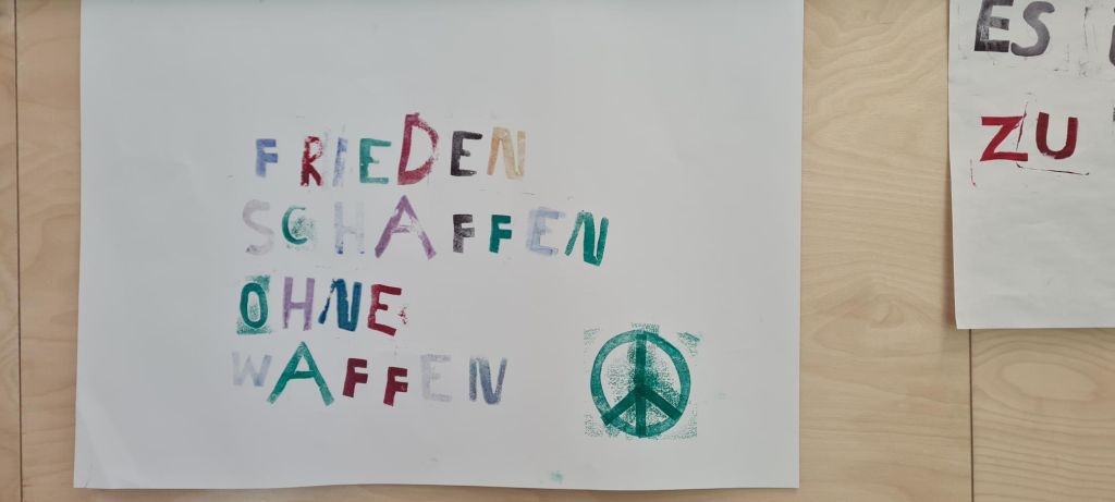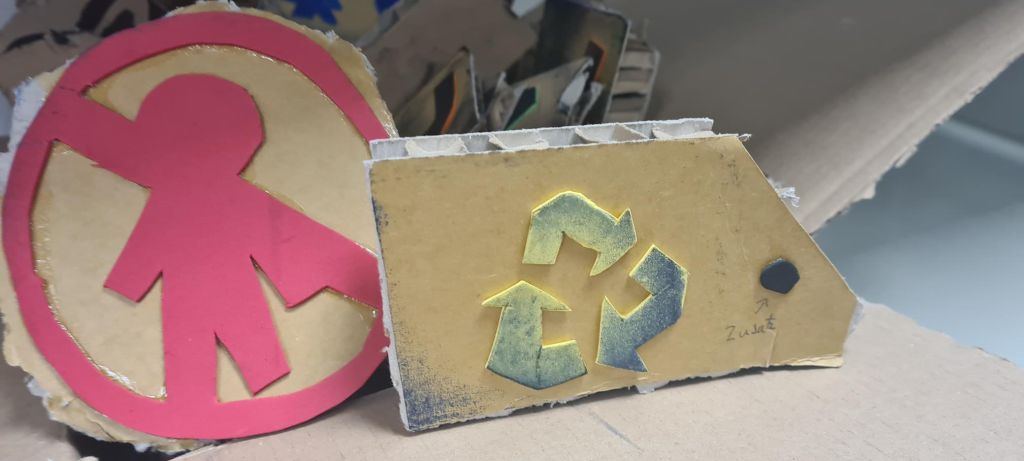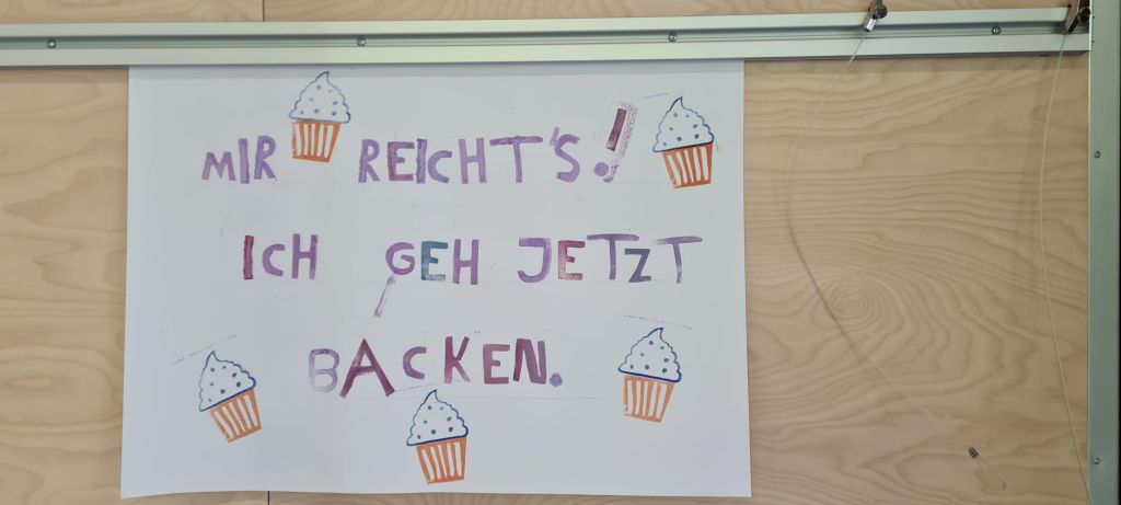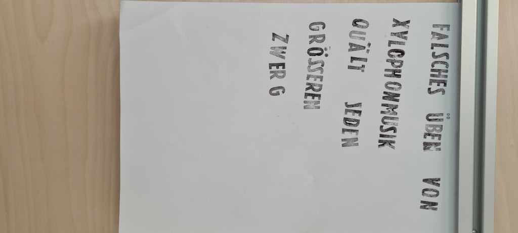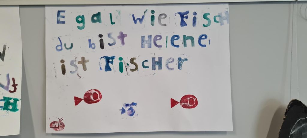 Die Schülerinnen und Schüler der Klassen 7.3 bis 7.5 übten sich im Erstellen eines Alphabets von Stempeln aus Pappe und Moosgummi (in Gruppen), dem Stempeln eines Spruchs, eines Zitats oder eines Liedtextes in Einzelarbeit. Anschließend ging es um das Erfinden eines zum Spruch passenden Motiv-Stempels, ebenfalls in Einzelarbeit. Danach stand das Erstellen von Buchstaben- und Motivstempeln zum Drucken von Pangrammen im Fokus, also Sätzen, in denen alle Buchstaben des Alphabets mindestens einmal vorkommen und die das Schriftbild einer Schrift zeigen. Diese Kunstwerke werden nun der Schulöffentlichkeit im gesamten B-Gebäude dauerhaft präsentiert.