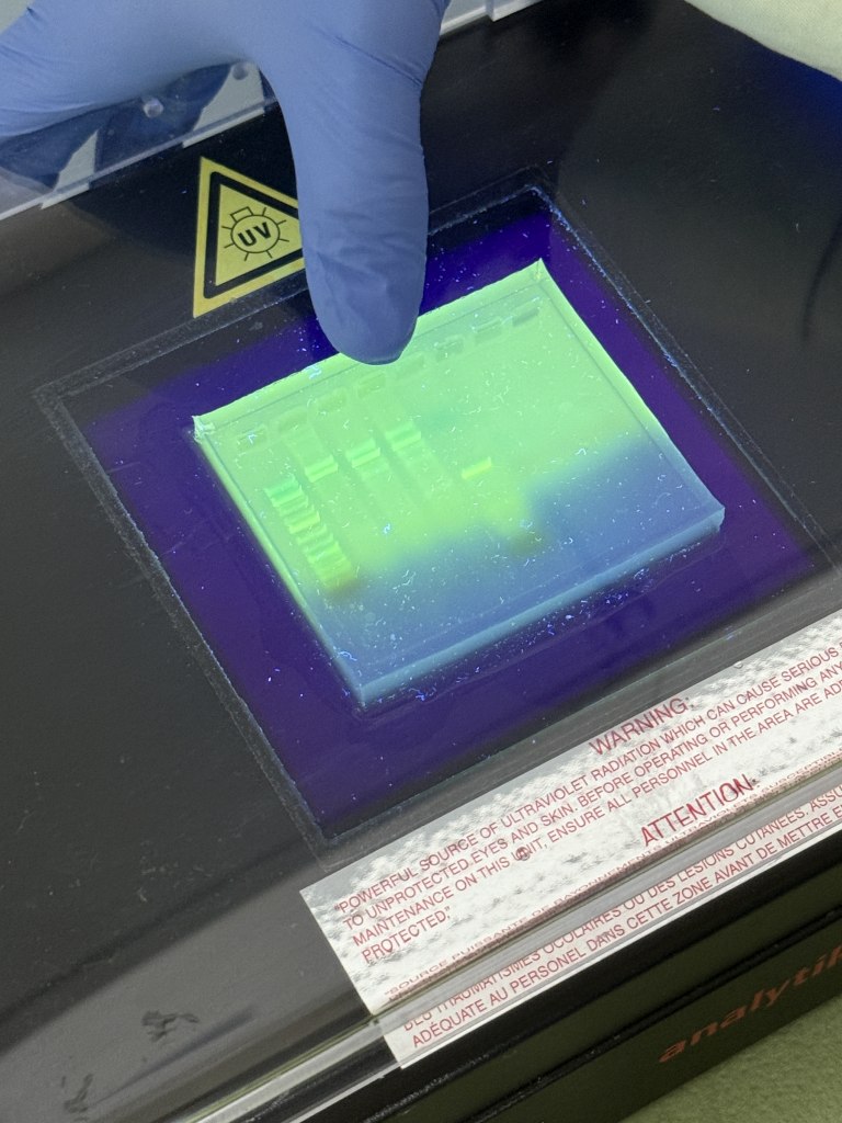 Durch die im Gel sichtbaren Banden ließ sich erkennen, ob das Gen erfolgreich vervielfältigt worden war. Die Position der Banden zeigte dabei die Größe der Fragmente und ermöglichte eine wissenschaftliche Auswertung der Ergebnisse. Besonders anspruchsvoll war das präzise Auftragen der Proben in die Gelkammern, bei dem ein hohes Maß an Konzentration und Fingerspitzengefühl erforderlich war.