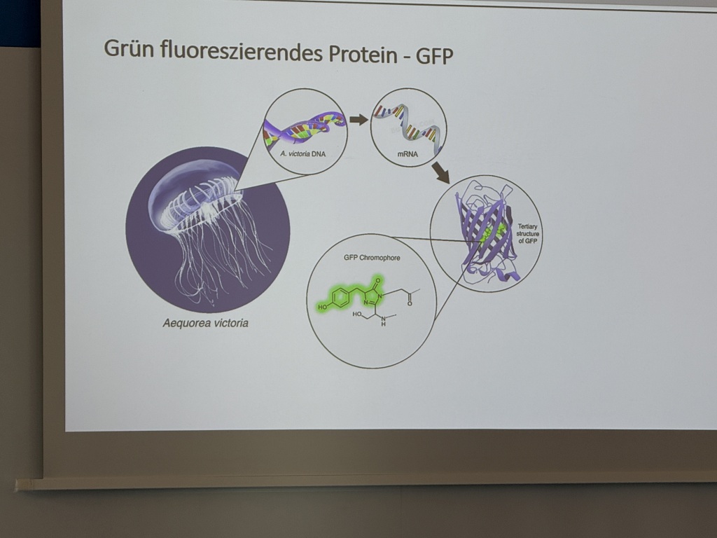 Im praktischen Teil arbeiteten die Schülerinnen und Schüler in Kleingruppen nach einer ausführlichen Anleitung mit dem Bakterium Escherichia coli. Ziel des Experiments war es, ein genetisch verändertes Plasmid, also einen ringförmigen DNA-Abschnitt, zu untersuchen, der ein bestimmtes Gen enthielt. Dieses Gen stammt ursprünglich aus einer Qualle und codiert für ein fluoreszierendes Protein, das das Bakterium unter bestimmten Bedingungen zum Leuchten bringt.
