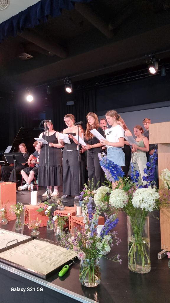 Für den musikalischen Rahmen sorgten eine Band und eine Gesangsgruppe unter der Leitung von Thomas Reutzel. Mit einfühlsamen Liedern schufen sie eine Atmosphäre, die zum Innehalten, Erinnern und Mitfühlen einlud – eine würdevolle Begleitung in einem Moment des gemeinsamen Abschieds und des frohen Erinnerns. Solistisch sang Kathleen Heinz mit Klavierbegleitung durch Thomas Reutzel „Scientist“ von Coldplay. Thomas Reutzel spielte „Somewhere over the Rainbow“ als Trompetensolo. Die Technik-AG unterstützte die Feier durch Ton- und Lichttechnik.