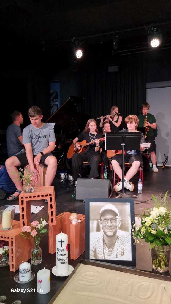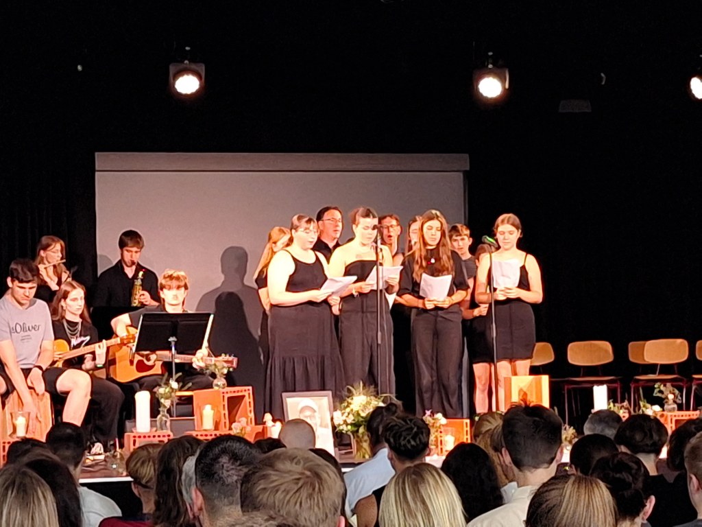 Aus diesen Erinnerungen gestalteten einige Schülerinnen ein besonderes Erinnerungsalbum, das zu einem zentralen Element der Feier wurde. Auszüge daraus wurden einfühlsam von Schülerinnen aus der SV und der Klasse von Simon Scheuermann vorgelesen und ließen dessen Persönlichkeit und Wirken noch einmal lebendig werden – seine Leidenschaft für den Unterricht, sein offenes Ohr, seinen Humor und sein Verständnis, mit dem er seinen Schülerinnen und Schülern begegnete.