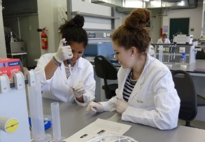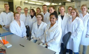 Als Vertiefung zu den im Unterricht erarbeiteten Fachkonzepten konnten die Schülerinnen und Schüler gentechnologische Arbeitsweisen kennenlernen und selbst anwenden. Dabei handelte es sich um Verfahren, die oftmals in Kriminalfällen zur Täterermittlung eingesetzt werden und als „genetischer Fingerabdruck“ bekannt sind. Die Methode, die die Schülerinnen und Schüler durchführten, war die sogenannte „Polymerase-Kettenreaktion“ zur Vervielfältigung von DNA-Abschnitten außerhalb der Zelle mit anschließender Gelelektrophorese. Letzteres dient dazu, DNA-Moleküle in einem Gel unter Wirkung eines elektrischen Felds aufgrund ihrer Ladung und ihrer unterschiedlichen Molekülmasse zu trennen. In Zweierteams führten die Leistungskurs-Schüler anhand eines Versuchsskriptes alle Einzelschritte selbständig durch, wobei besondere Konzentration und Präzision beim Pipettieren geboten war.