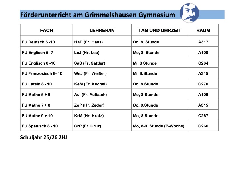 Uns als Grimmelshausen-Gymnasium liegt es am Herzen, Schülerinnen und Schüler zu unterstützen, auch und gerade, wenn nicht die „befriedigende Leistung“, die Note 3, erreicht werden konnte. Daher bietet das Grimmels Förderunterricht für Schülerinnen und Schülern in den Hauptfächern an. Dieses Angebot ist kostenlos und im Allgemeinen freiwillig.