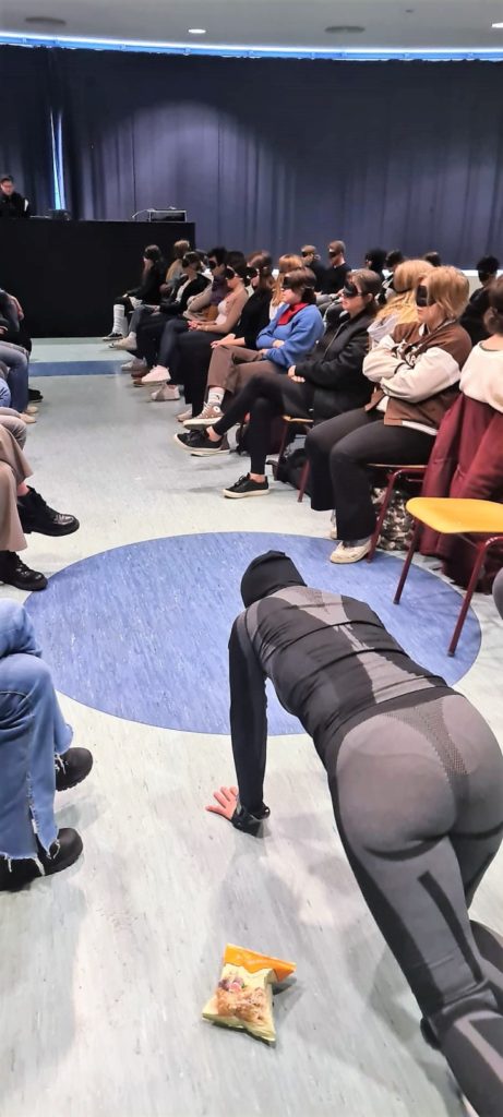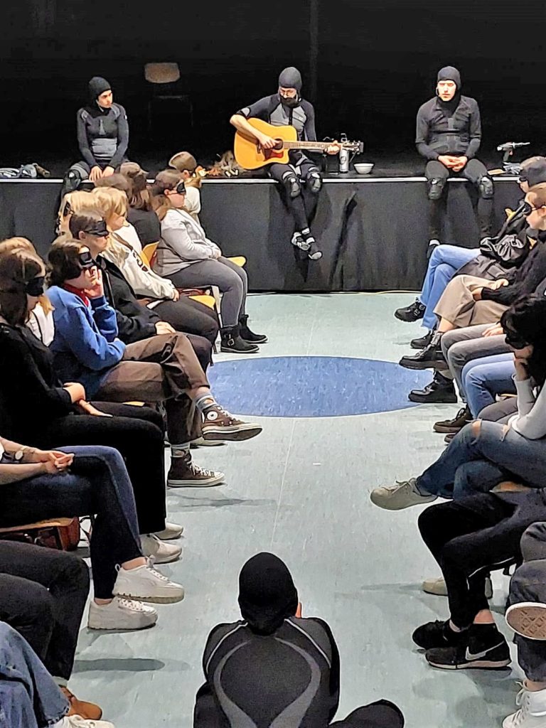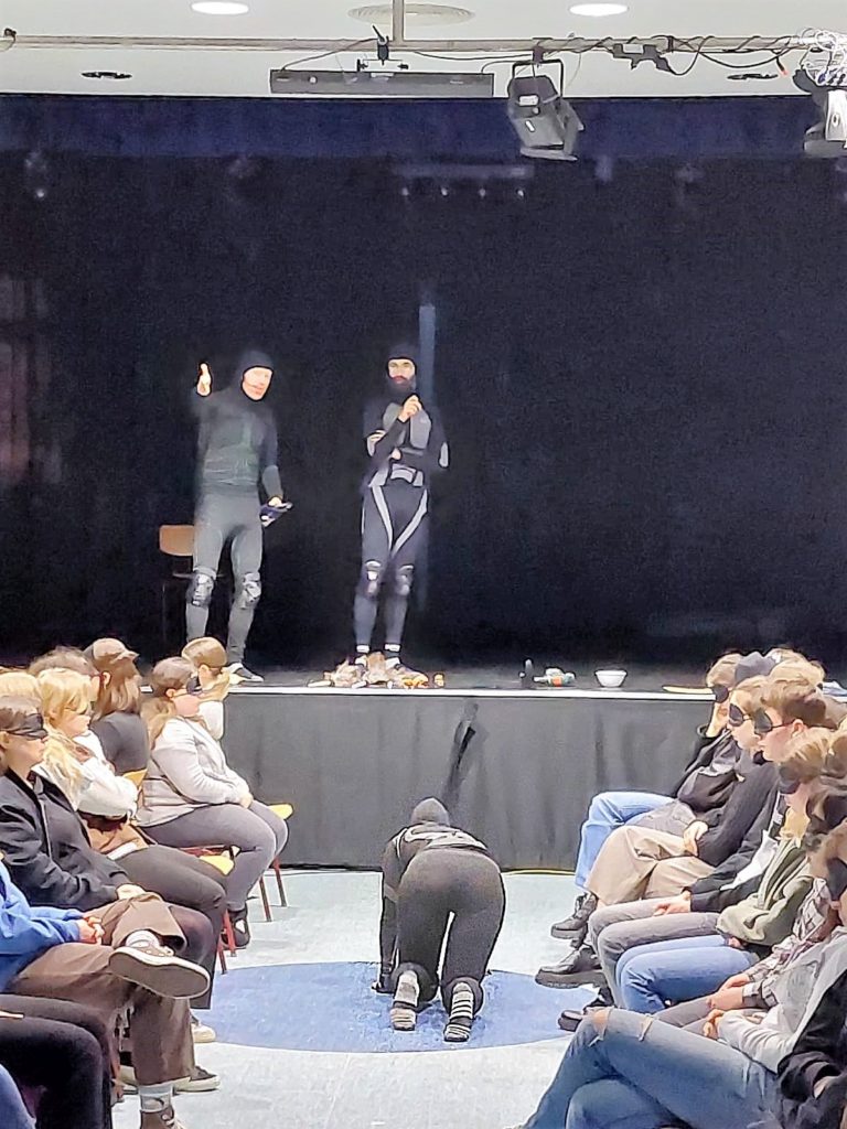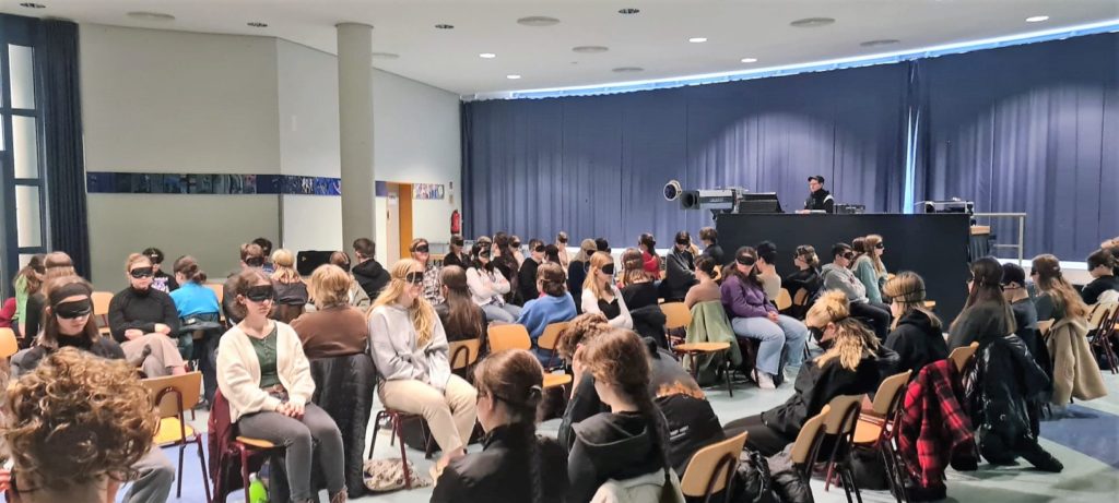 So konnte das Grimmels die Schauspielgruppe „Kortmann und Konsorten“ mit dem Theaterstück „Die Verwandlung“ von Franz Kafka an die Schule holen. Die DS-Kurse aus Q2 und Q4 und der Leistungskurs Deutsch der Q2 wurden Teil eines außergewöhnlichen Theatererlebnisses in vollkommener Dunkelheit. Mithilfe von Augenmasken hatten die Schülerinnen und Schüler die Möglichkeit, ihre ganz eigenen Bilder im Kopf entstehen zu lassen, während die fünfköpfige Schauspielgruppe zwischen den Stuhlreihen den Raum mit Geräuschen, Stimme und Musik bespielten. Hierbei wurde das Publikum zu Beginn des Stückes einzeln platziert, um schon so das Gefühl der Isolation von Gregor Samsa nachempfinden zu können. Das Unbehagen, welches der Käfer empfindet, wurde zudem durch ein ständiges Ächzen, Stöhnen und schwerfälliges Kriechen sowie einem Luftzug hier und einer Berührung da, verstärkt. Das Spiel ermöglichte es, sich intensiv in Gregor Samsa und sein Leiden als Käfer hineinversetzen zu können.