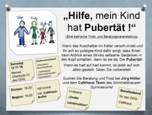 Das GGG-Caféhaus lädt zum dritten Höller-Benefiz-Abend ein. Am Samstag, dem 12. November 2016 um 19.00 Uhr vertieft Grimmels-Lehrer und Entertainer Jörg Höller humorvoll das Thema  „Pubertät“.