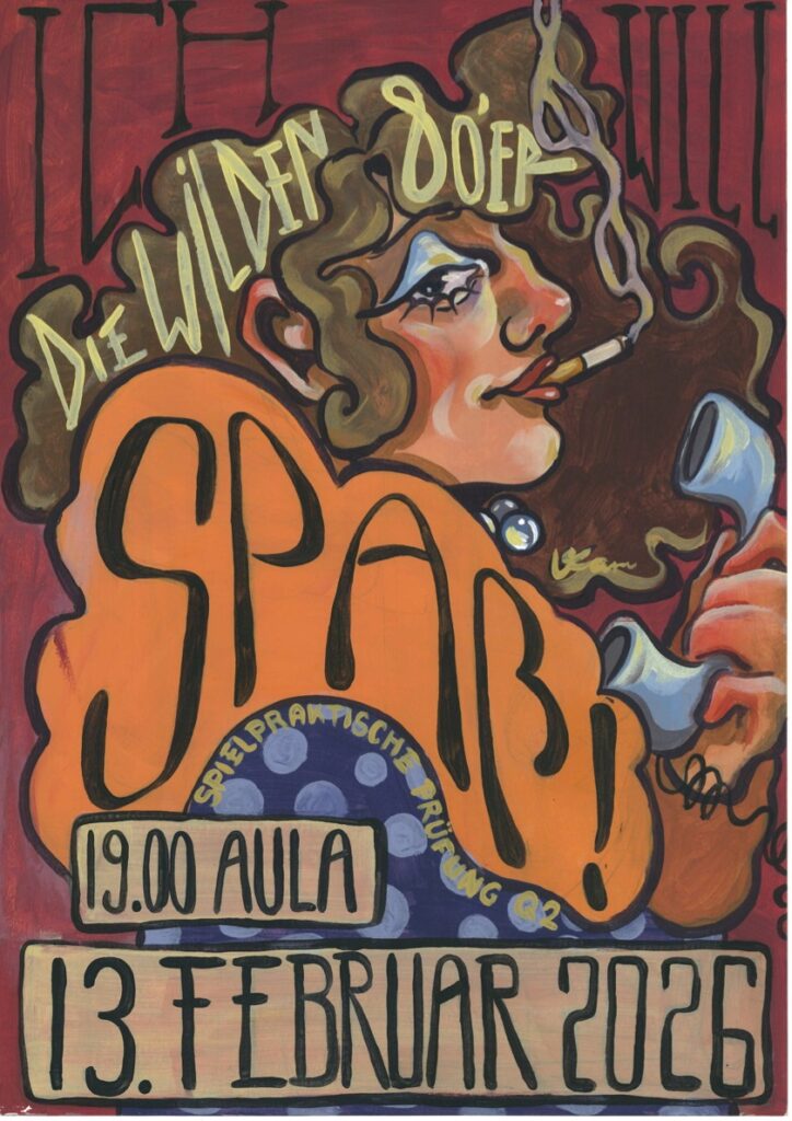 Unter dem Motto „Ich will Spaß – Die wilden 80er“ gestalten die beiden DS-Kurse der Q2 gemeinsam mit der Band und der Technik-AG einen bunten szenischen Abend, der am Freitag, 13.02.26, ab 19 Uhr in der Aula des Grimmels stattfindet. Dazu sind alle herzlich eingeladen.