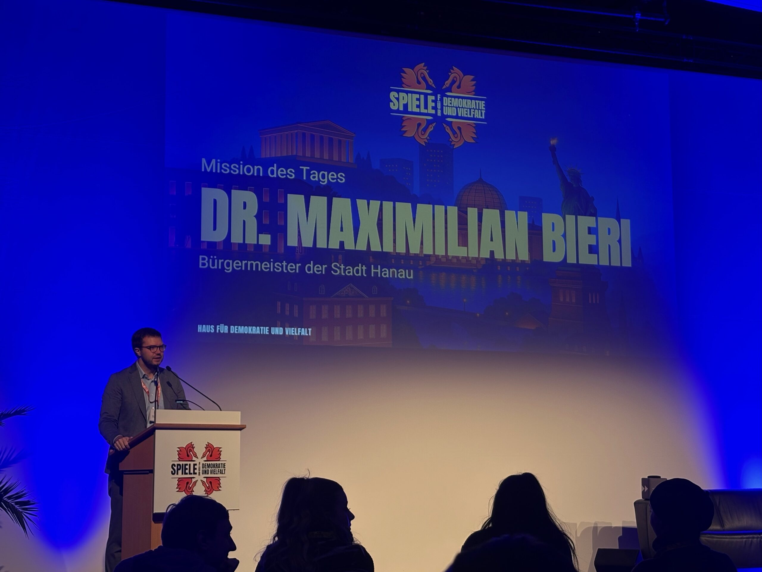 Mit diesen einführenden Worten begrüßte Dr. Maximilian Bieri, Bürgermeister der Stadt Hanau, die rund 160 Teilnehmerinnen und Teilnehmer der Auftaktveranstaltung „Spiele für Demokratie und Vielfalt“ im Plenarsaal des Congress-Parks Hanau.