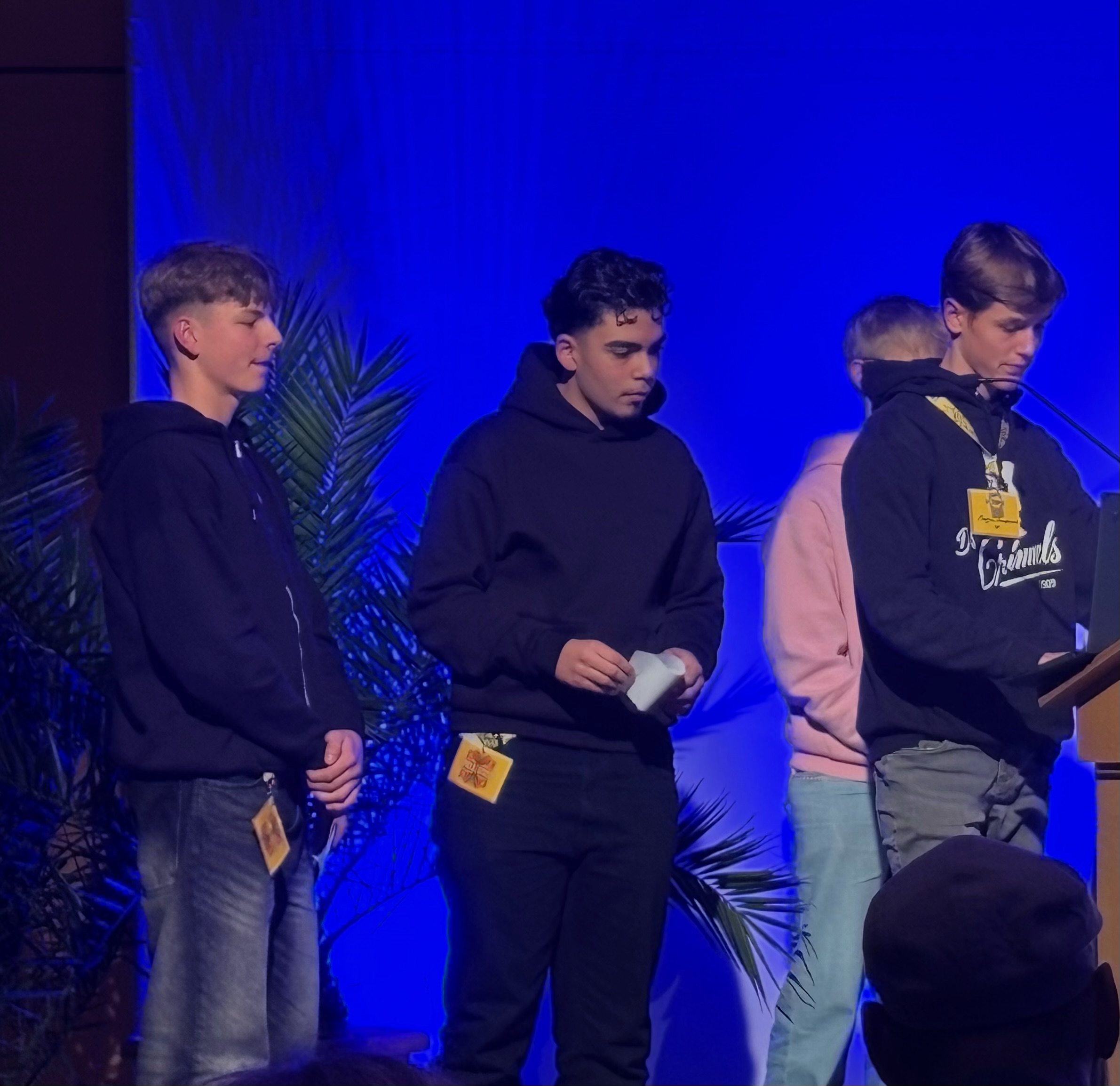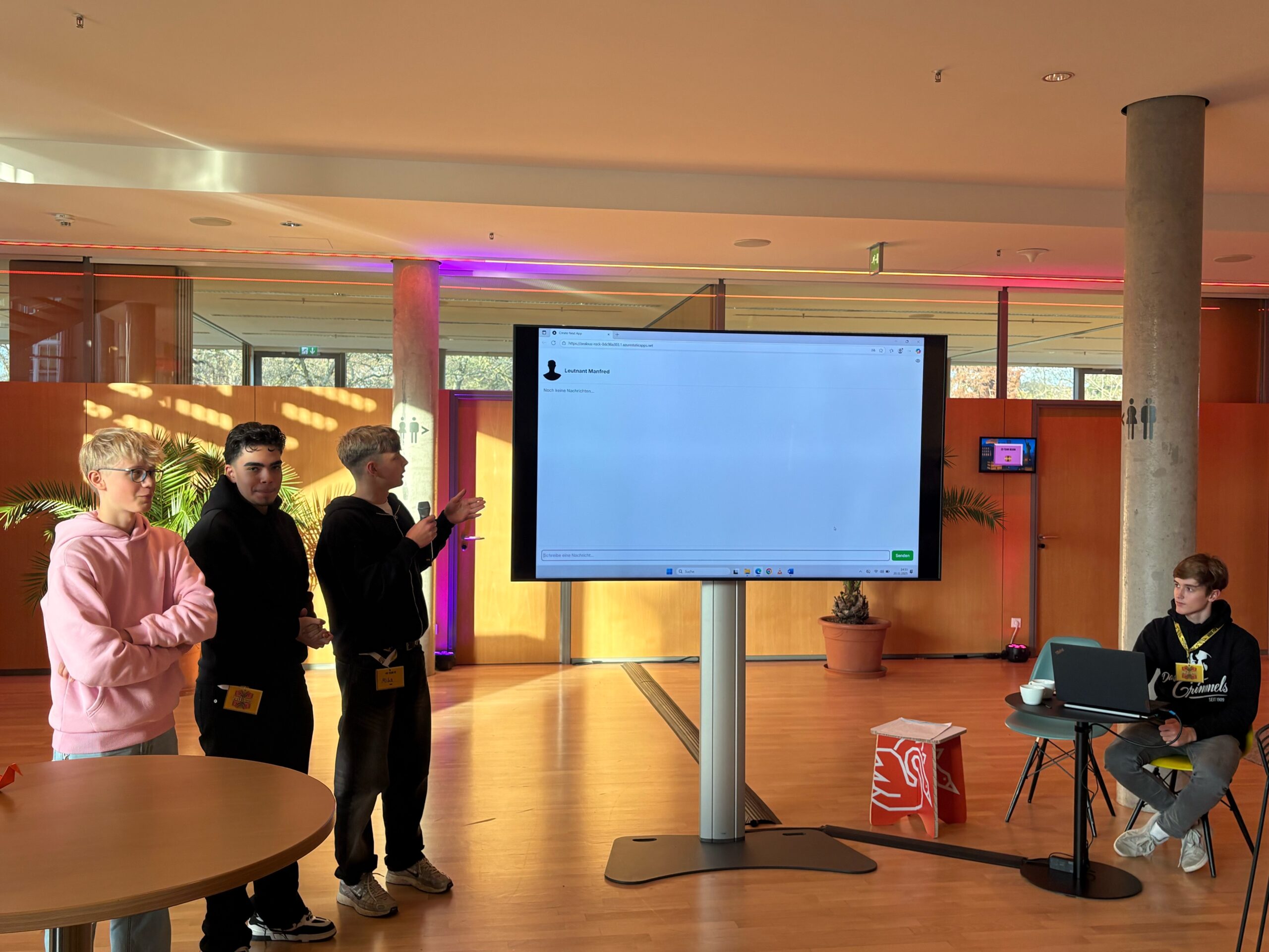 Ein besonderes Highlight war die Präsentation von Magnus Hauptmann (9.5), Berkay Yurtcu (9.6), Mika Stockenberg (9.3) und Philip Herling (9.3), deren gemeinsames Arbeitsergebnis in der Projektgruppe bei einer demokratischen Abstimmung ausgewählt wurde. Die Schüler entwickelten hierbei den KI-Charakter „Leutnand Manfred“, der im digitalen Raum auf motivierende Weise Rede und Antwort zu gesellschaftspolitischen Fragestellungen steht. Isla Schneider (9.2) und Thea Stör (9.2) berichteten auf der Bühne eindrucksvoll von ihren Erfahrungen und Empfindungen in ihren multiperspektivischen Rollen der durchgeführten Planspiele zu „Fakenews“ und „Cannabisprävention“.  Dabei verdeutlichten sie, wie durch simulatives Lernen reale Kontroversen im Sinne der Demokratiebildung sichtbar und erfahrbar gemacht werden können. Passend zur aktuell im Gemeinschaftskundeunterricht behandelten Unterrichtsreihe „Demokratie lernen und leben“ konnte mit der Veranstaltung inhaltliche Relevanz mit spielerischer Motivation verbunden werden.