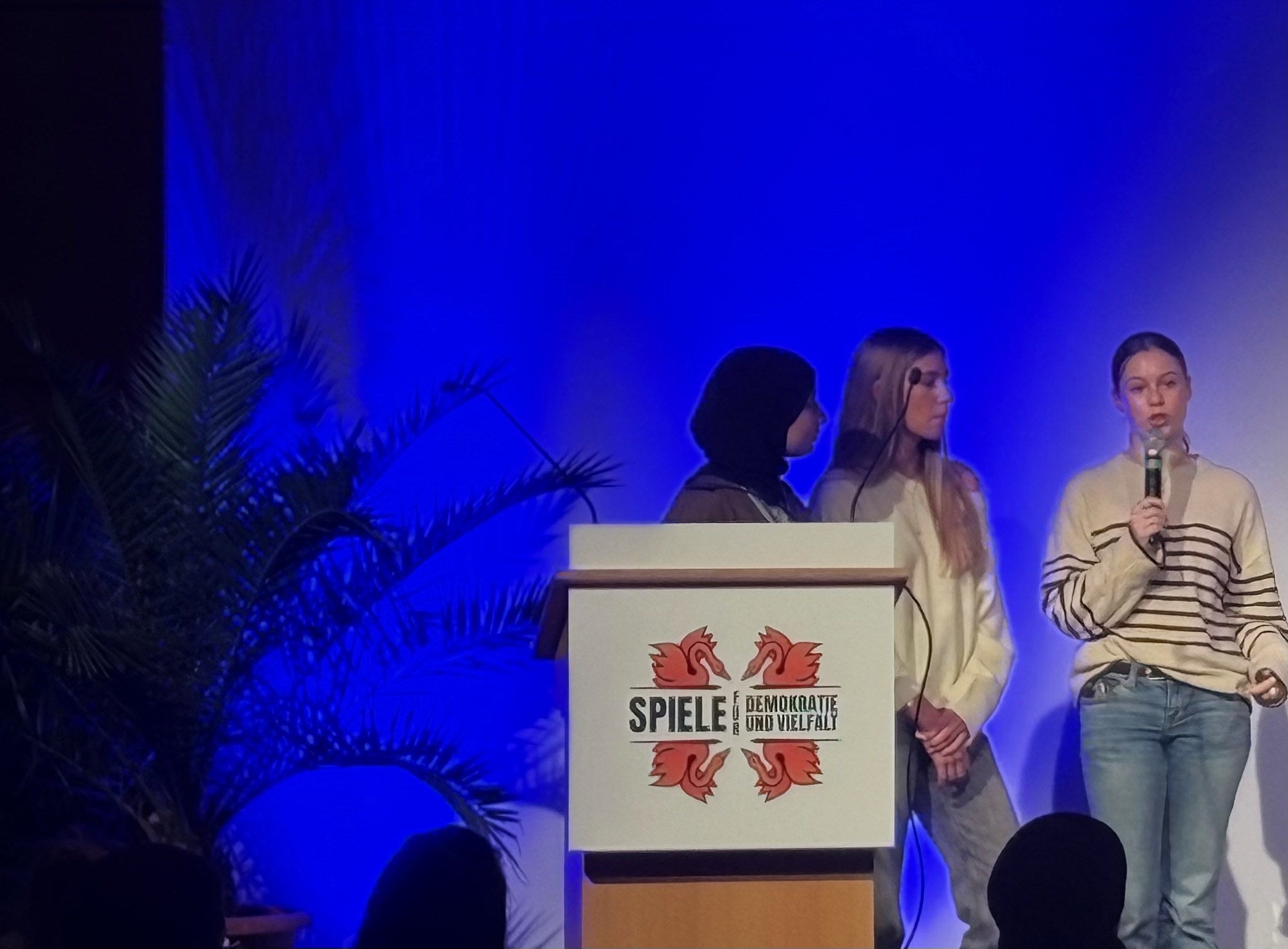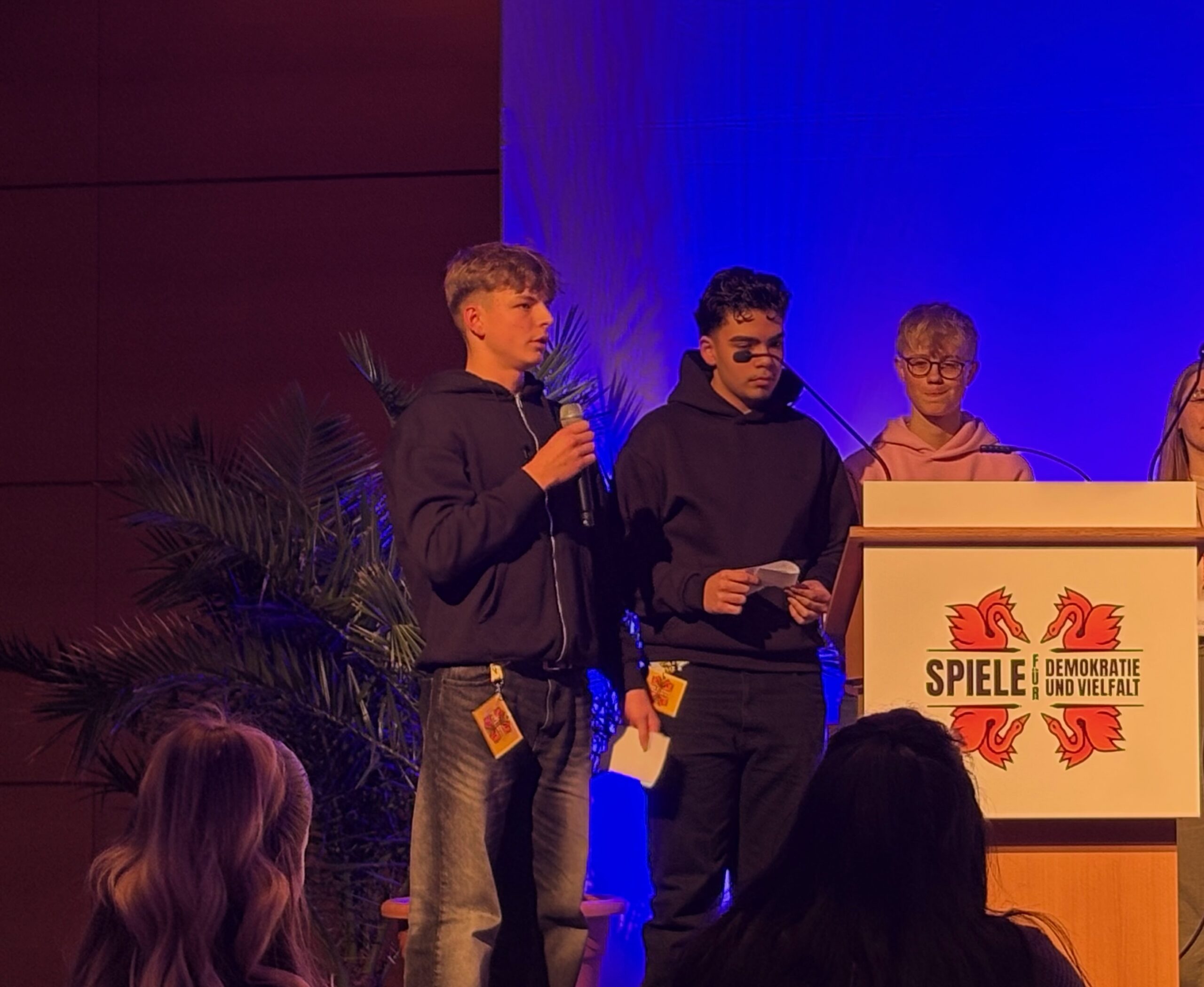 Als Show Down wurden verschiedene Ergebnisse der Schülerinnen und Schüler im Plenarsaal vor einem großen Publikum vorgestellt und in einem gemeinsamen konstruktiven Austausch mit Expertinnen und Experten aus den Bereichen politischer Bildung, Künstlicher Intelligenz und Spieleentwicklung konkretisiert.