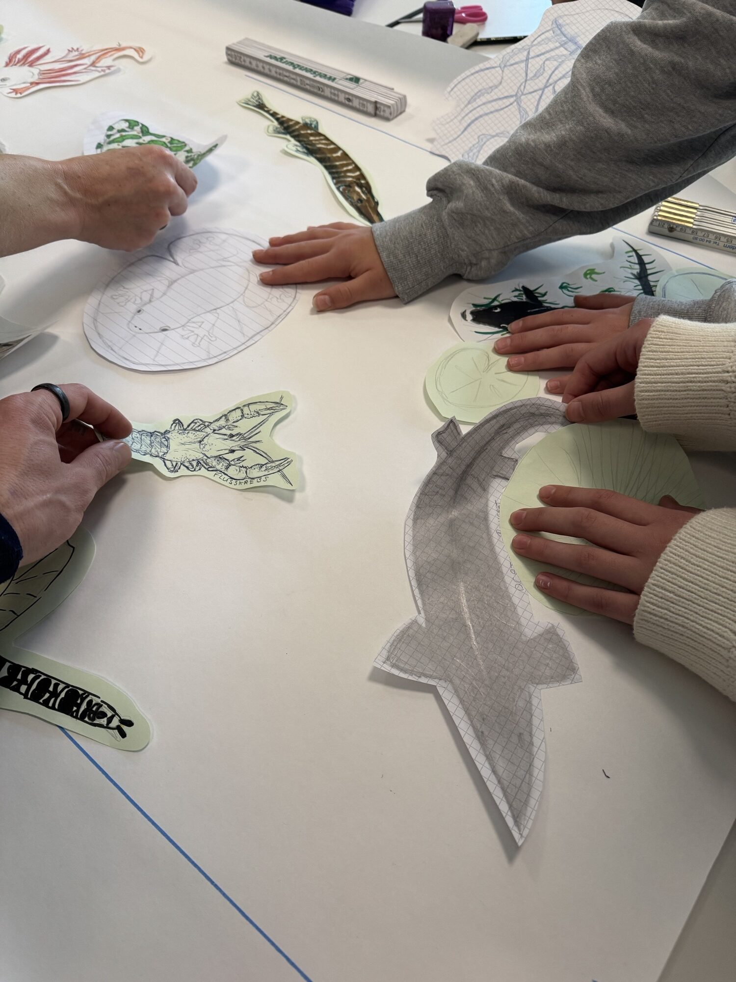 Arbeitstitel des Unterfangens ist die Darstellung der Wurzeln unserer Schülerinnen und Schüler durch Bewohner von Binnengewässern und einigen Aquarienexoten. Die Teilnehmerinnen und Teilnehmer aus den Jahrgangsstufen 6 bis 12 recherchierten dazu Fische und Amphibien, die bedroht oder in breiter Vielfalt in den Ländern ihrer Vorfahren oder in ihrer ursprünglichen Heimat wohnen. Schön war es festzustellen, dass in Europa viele Fische und Amphibien sich auf einem weiten Verbreitungsgebiet finden, das viele Landesgrenzen überspannt, wie zum Beispiel der Hecht oder der Karpfen. Bei der Entwicklung der endgültigen Komposition wurde das Gesamtbild noch um einige Exoten sowie geheime Schätze erweitert. Als Sinnbilder der internationalen Gemeinschaft finden diese nun eine neue Heimat als temporäres Kunstwerk in dem Becken vor der Replik des „Knaben mit Taube“ nach dem Entwurf von Kurt Lehmann. Die Stellvertreter aus ca. 10 Nationen laden nun ein zum Beobachten, Suchen und Finden.