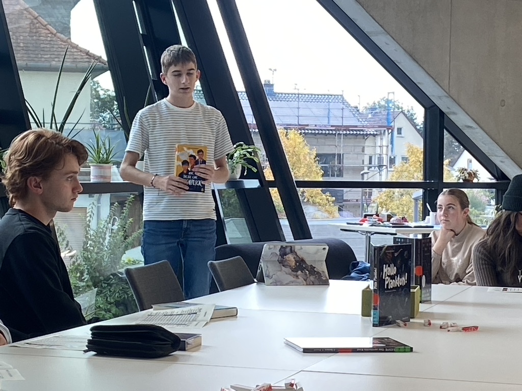 Unsere Aufgabe in der AG war es nun, selbst Jury in den Kategorien ,,Jugendbuch” und ,,Preis der Jugendjury” zu spielen. Das Motto dabei war ,,Welche Bücher würden wir zum Sieger küren, säßen wir in der Jury?”. Mal alleine, mal im Duo oder in einer kleinen Gruppe stellten die Teilnehmenden die nominierten Bücher vor, erläuterten Handlung und Protagonisten, Schreibstil und dessen Wirkung sowie die eigene Meinung, ob das Buch ,,preisverdächtig” sei oder nicht. Nachdem auch eine kurze Textstelle vorgelesen worden war, konnten sich jene, welche das vorgestellte Buch nicht gelesen hatten, einen guten Überblick verschaffen und 0 bis 5 Punkte in drei Kategorien vergeben. Insbesondere gefragt waren der Realitätsbezug sowie die Authentizität. Schafft es das Buch, jungen Lesenden neue Perspektiven und Blickwinkel auf die Welt zu eröffnen? Bietet es Raum für eigene Interpretationen? Ist die Sprache ansprechend und spannend? Nachdem jeder für sich selbst diese und weitere Fragen beantwortet hatte, wurden diese den Moderatoren der Veranstaltung abgegeben. In dieser Rolle glänzten Emma Weyer und Elias Reißer; sie führten souverän durch den Nachmittag und sprangen spontan ein, falls es einer erkrankten Person nicht möglich war, ihr Buch vorzustellen.